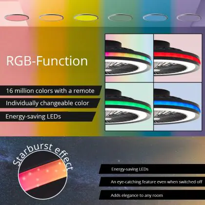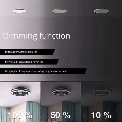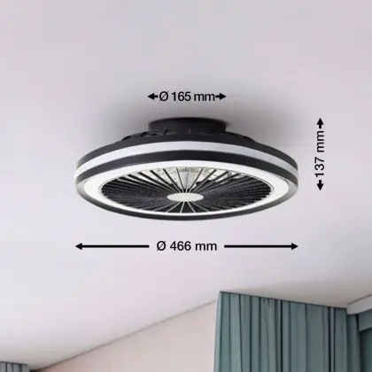 Der Brilliant Palmero Ventilator Plastik Metall Schwarz 36W 5000lm - 827-865 CCT | 466mm - Fernsteuerung Dimmbar integriert sich unauffällig in verschiedene Einrichtungsstile – von urbanem Minimalismus bis zu klassischen Wohnwelten. Die sauberen Linien und die zurückhaltende Farbgestaltung machen ihn zu einer langlebigen Designlösung.