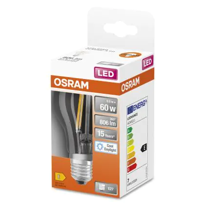 Die Osram Classic LED E27 Birne Fadenlampe Klar 6.5W 806lm - 865 Tageslichtweiß | Ersatz Für 60W ist eine effiziente E27 LED-Lampe mit Retrodesign und der perfekte Ersatz für Ihre konventionellen 60W Lampen mit E27. Zudem strahlt sie Licht in der Farbtemperatur 6500K - Tageslichtweiß aus und punktet durch eine lange Lebensdauer.